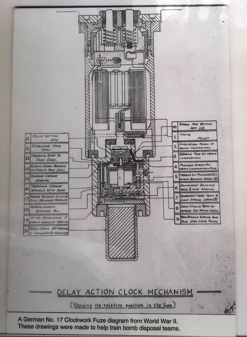 Description: The normal type of bomb fuze is 110 mm long by 50 mm wide (measured from the head to the base) the fuze consists of usually 2 charging pins, although if the fuze has only one circuit, the (17) for example then only one is present, the other is a dummy.