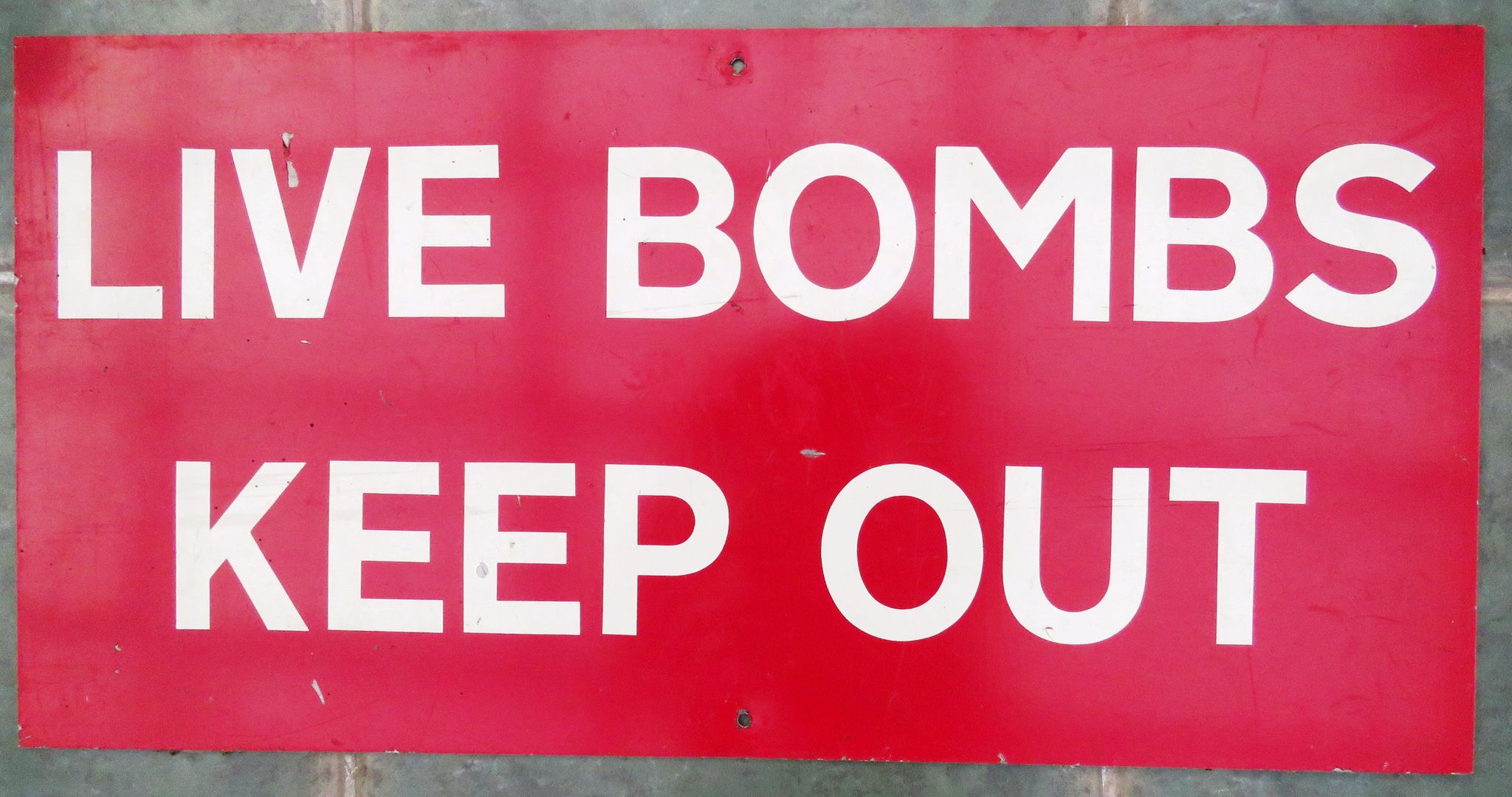 Sign, 'Live Bombs Keep Out' 24" by 12", dating from around the 1970's